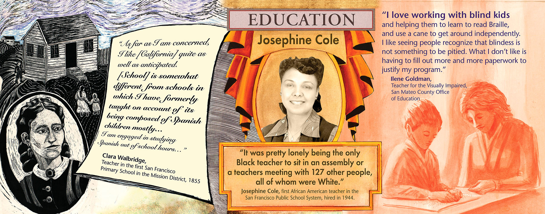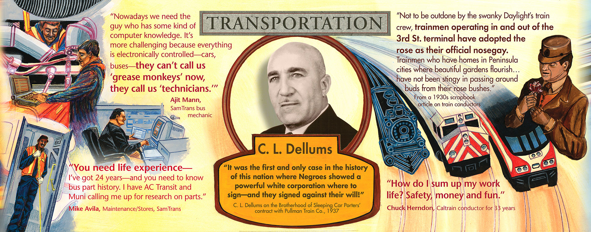 Our Work Life is the result of a collaboration between artists Kate Connell and Oscar Melara (Book + Wheel) and the Labor Archives and Research Center at San Francisco State University. The first phase of the project was a sixty-foot-long mural, eleven inches high, mounted to wrap around the inside of SamTrans public commuter buses. Mural panels told the story of Bay Area labor history with drawn and painted images and multilingual quotes. The goal of Our Work Life was to build a sense of community between the regular commuters. The mural was accompanied by a free color handout modeled on a bus transfer, it invited viewers to further explore local labor history. The project was mounted on seven SamTrans commuter buses, which traveled long distances, from Palo Alto into San Francisco many times a day, carrying hundreds of commuters. Copies of the panels were donated to libraries and unions. Our Work Life has been shown in galleries and libraries and is permanently installed at the Evans Campus of City College of San Francisco.